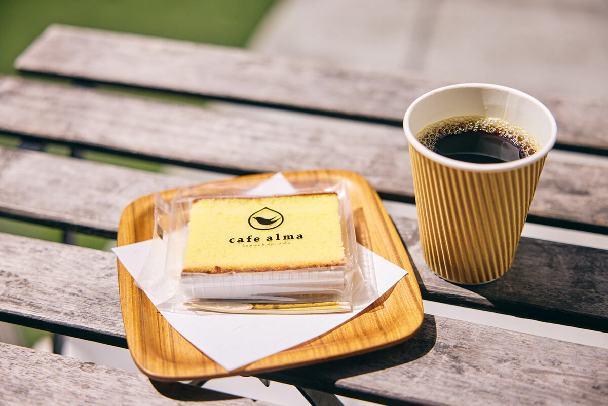 本宮大社内にある「cafe alma」では、自家焙煎コーヒーとカステラで糖分を補給。熊野古道沿いで採取したニホンミツバチの希少なはちみつを使った人気の「くまみつカステラ」は、しっとりした食感と爽やかな甘みがおいしい。