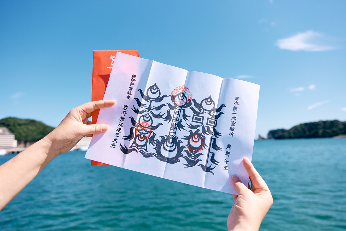 熊野三山では、それぞれ異なる図柄の八咫烏で描かれた「カラス文字」の御神符「熊野牛王神符(くまのごおうしんぷ)」をいただくことができます。