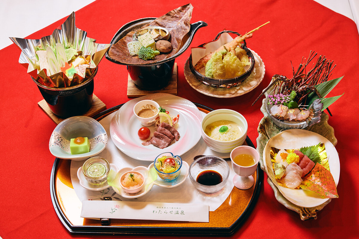 温泉につかったあとは、テーブルいっぱいに並んだ夕食の会席膳がお出迎え。