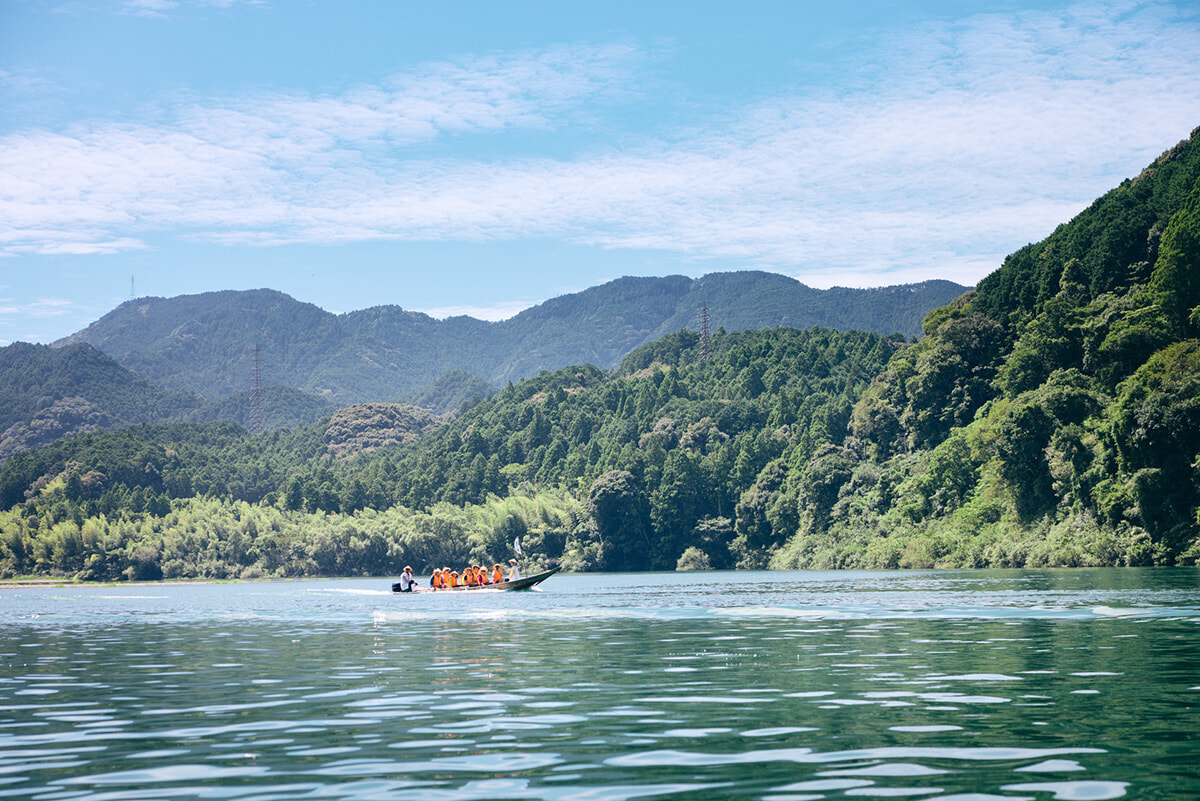 「今日の熊野川はひときわキレイです」と、同乗するガイド役の語り部さん。本当に美しくてうっとり! 巷では、「熊野ブルー」とも呼ばれているそう。川岸から熊野杉でつくられた川舟に乗船、約16kmの行程を1時間30分近くかけて下っていきます。