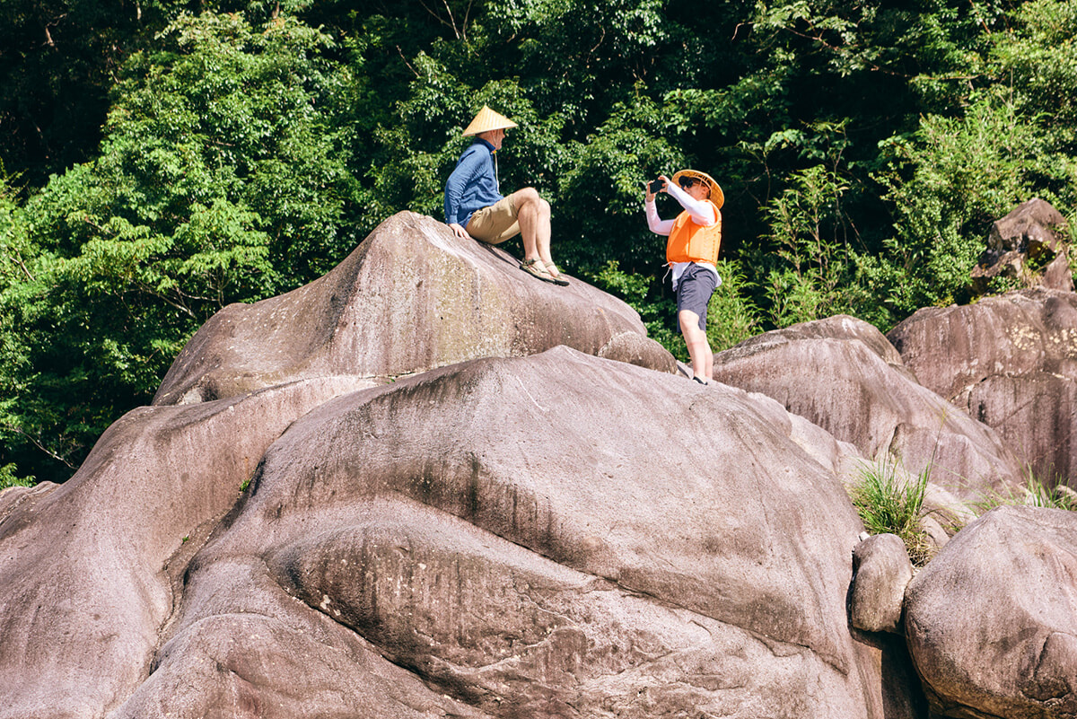 熊野の緑の深い山々や滝、火山活動でできた奇岩など、河岸の眺めは変化に富んでいて、途中、舟を留め、鬼の背骨のように見えるので「骨嶋」と呼ばれる岩に登る時間もありました。語り部さんの説明も楽しく、時間はあっという間に過ぎていきます。