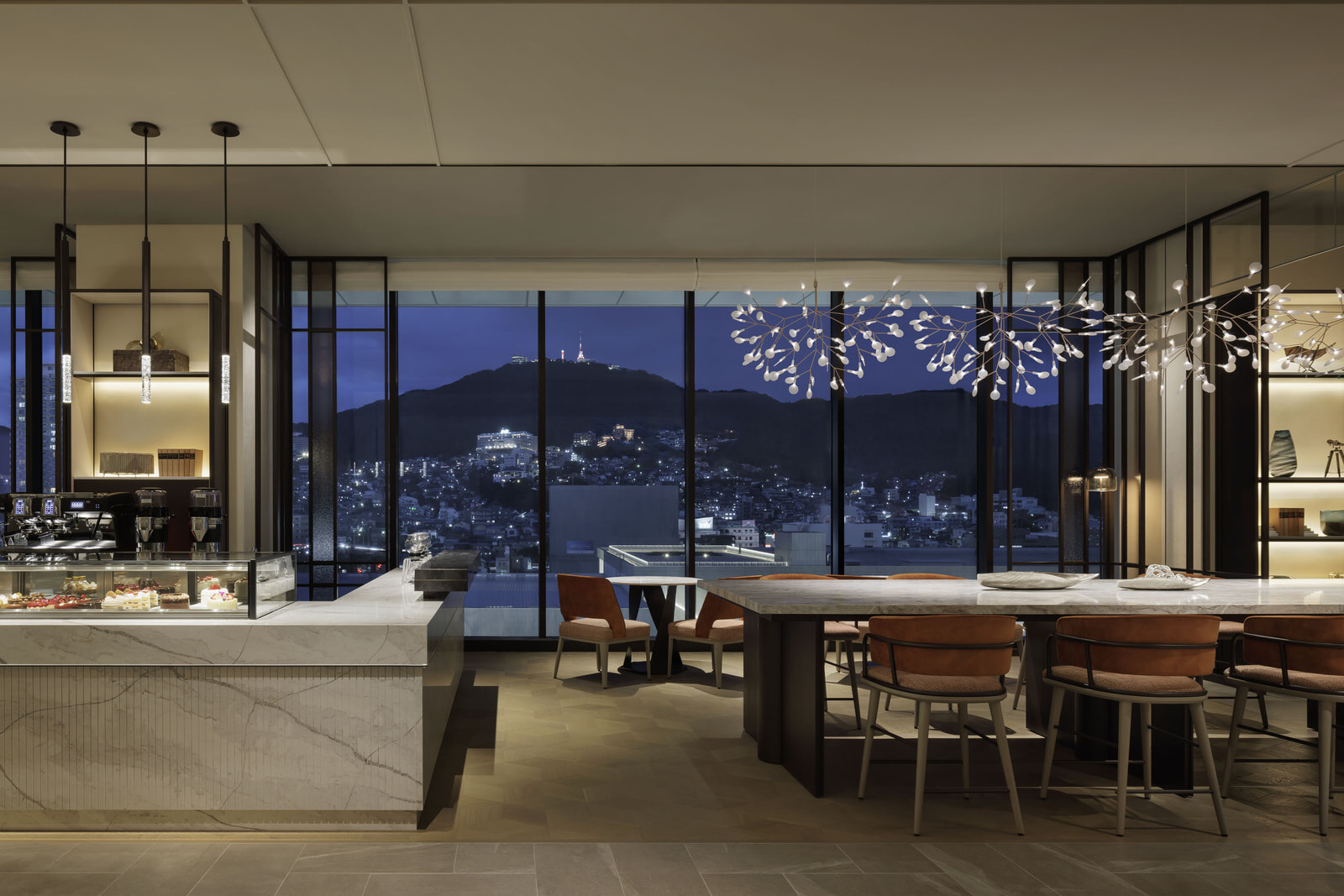 「いずれ長崎のシンボルに」と願うホテルですが、長崎駅に隣り合うホテルのロケーションは素晴らしく、7階に位置するレセプションに到着しチェックインする時から、真正面に眺めるシンボリックな稲佐山を望め、その麓まで広がる長崎の街と港も見渡せます。夜景となるとよりドラマチックな美しさに驚かされます。2021年、9年ぶりに開催された「世界夜景サミット in 長崎」において、モナコ、長崎、香港の三都市が「世界新三大夜景都市」に認定されました。これで”長崎”の名誉がまた増えたことになります。夜景でなくとも、日中はホテル7階のレセプションエリアから、南に長崎港の東西を結ぶ斜張橋、美しいフォルムの「女神大橋」を見晴らし、大浦天主堂やグラバー園が位置する南山手エリアや、夕陽を望む西側には長崎市のシンボル・稲佐山(333m)が、”これぞ長崎”という360度の情景を魅せてくれます。