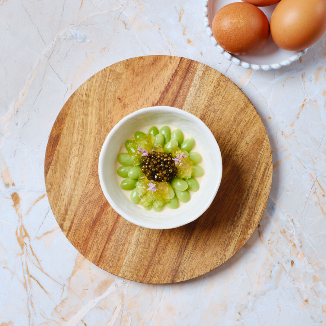 一方、日本代表の神田裕行は、過去に何度も単一食材プログラムに参加してきたベテランアンバサダーだ。エッグをテーマに神田シェフが提案したのは、前菜の冷製茶碗蒸し。枝豆、キャビア、出汁のジュレに穂ジソをあしらった一品は、クリュッグ グランド・キュヴェ 171 エディションと供された。