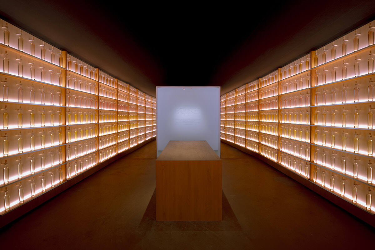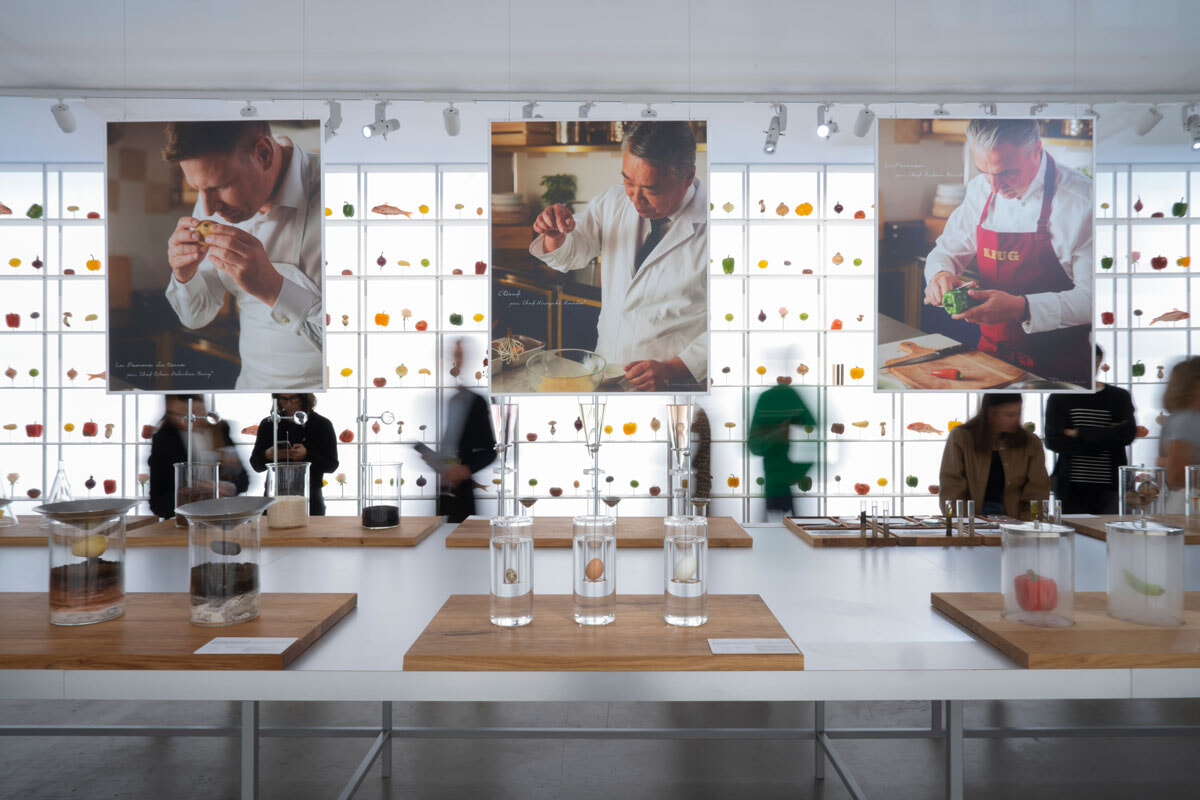 このイベントのために、アンヴァリッド駅の旧駅舎内には期間限定のレストランが出現した。ウェイティングサロンの先には400本のワインが並ぶ壁があり、異なる区画から生まれたワインを、ボトルの微妙な色のニュアンスで視覚的に伝える。次の部屋では、テーマとなった10の食材を嗅覚と視覚で確認、いよいよキッチンを囲むカウンター席へと誘われる。