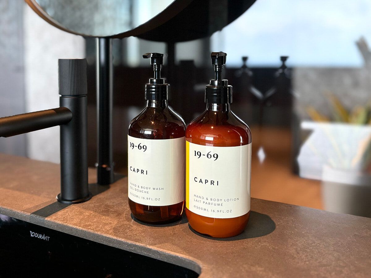 備えつけルームアメニティは4月に開業したセブン バイ セブン 糸島と同様、スウェーデン人アーティスト ヨハン・ベルゲンが手掛けるカルチャー・コスメティックブランド19-69のカプリ。