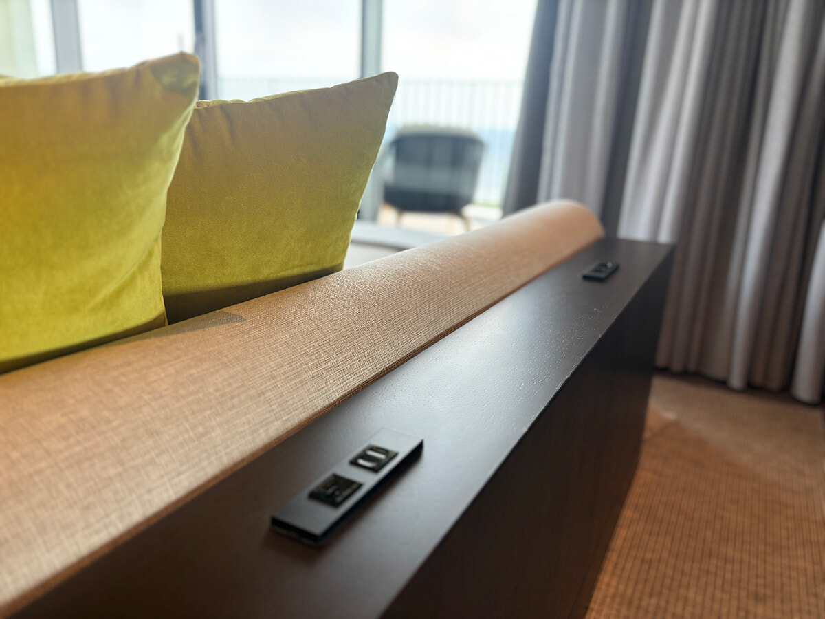 部屋のいたるところにコンセントが……! アメニティバッグの中にはアイマスクとイヤホンがセットされていて、細部までのこだわりはこんなところにも。