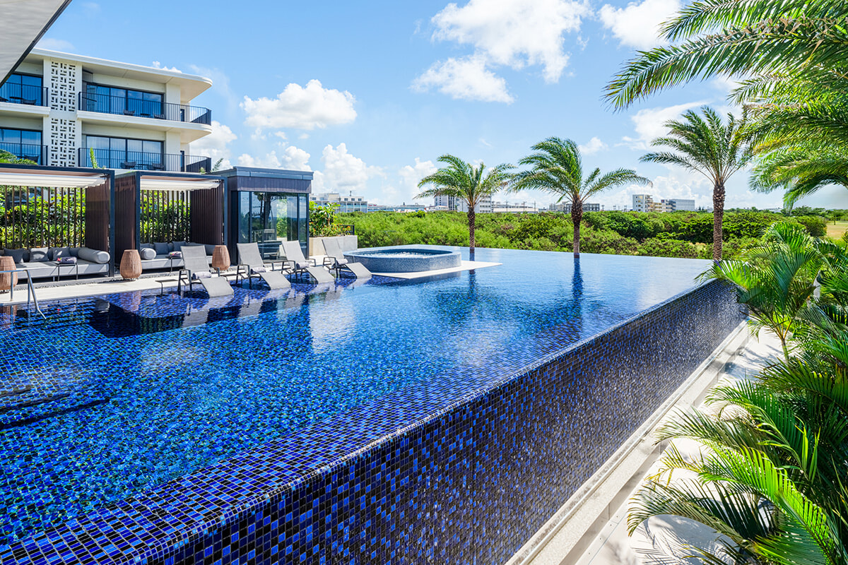 島の風景との一体感が味わえる20歳以上限定のプールクラブ/インフィニティプール。ドリンクやカクテルが楽しめるプールバーをはじめ、サウナや水風呂が設置され、カバナ(有料)を予約すればさらにリラックスしたオアシスを体感できる。