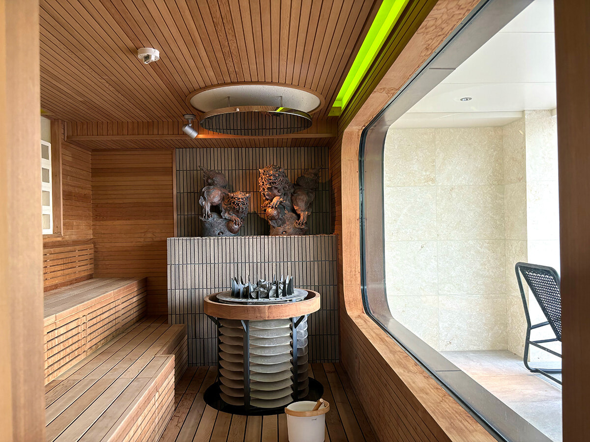 シーサーの口から噴射される水や、サウナストーブをデイゴの花に見立てたデザイン、霧を使った大胆なロウリュ体験が楽しめる1Fのシーサーサウナ。2種類の水風呂も設置される。