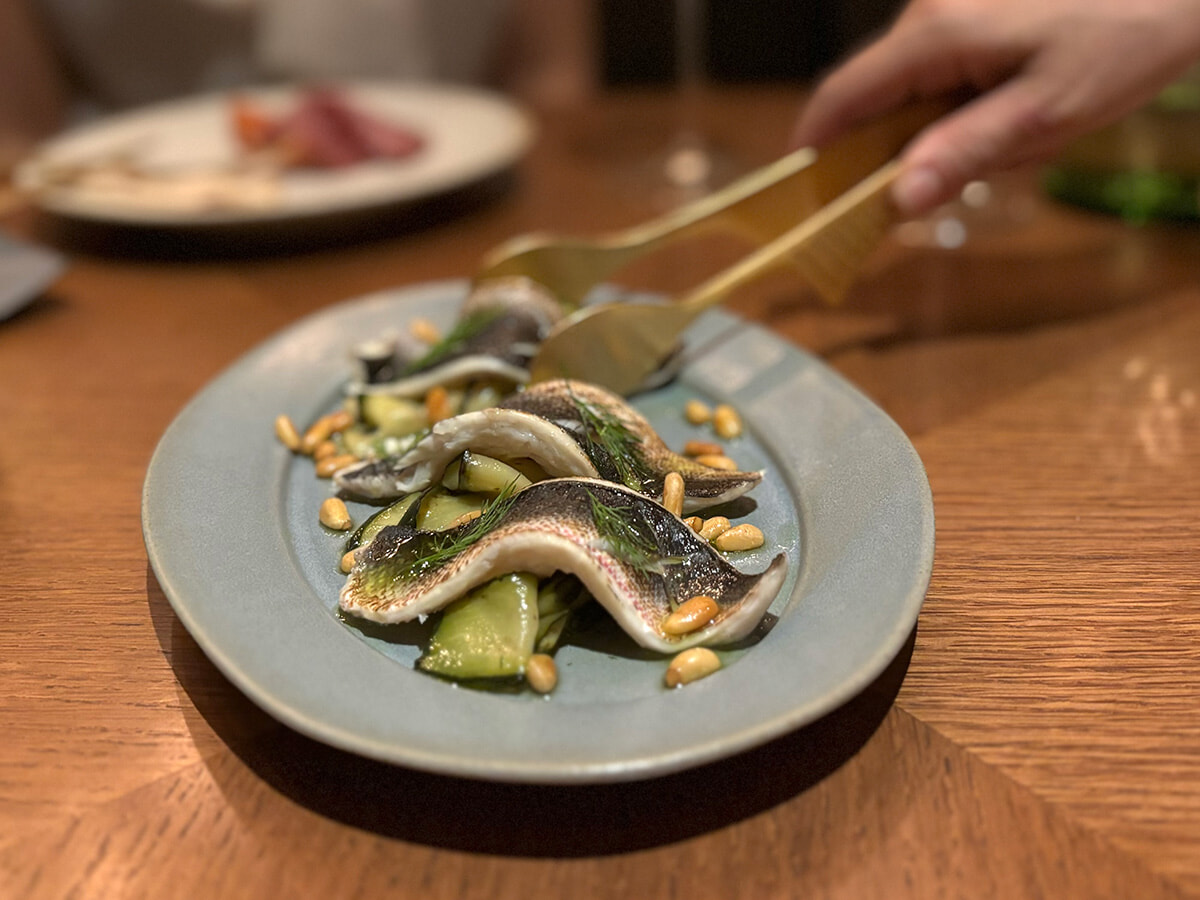 島魚”グルクン”をフランボワーズと塩で軽く〆め、皮目を香ばしく炙った「炙りグルクンとズッキーニのマリネ」