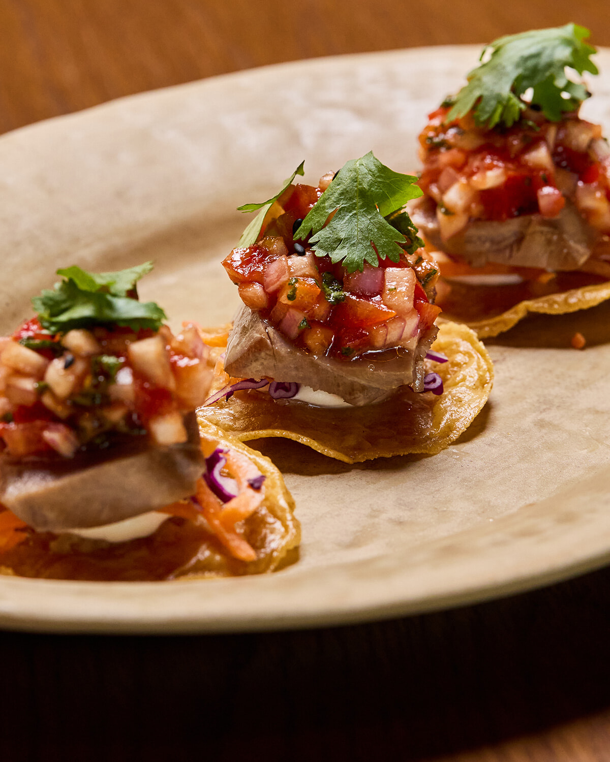 石垣島名産のマグロを桜チップでスモークし、クミンの香りやハラペーニョの辛味をアクセントに仕上げた「燻製マグロとスパイシーサルサのトスターダ」