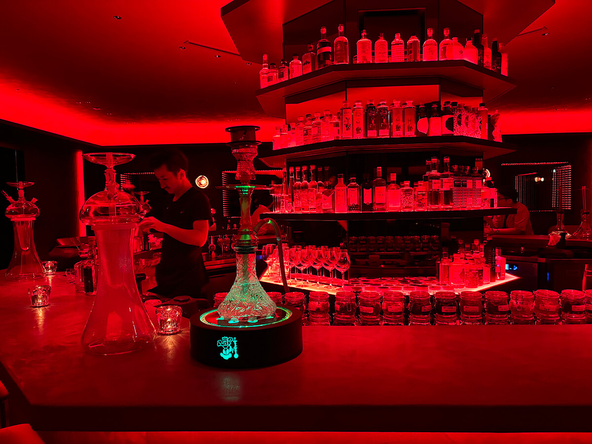 食後ぜひ訪れたいのが、地下のバー/ ナイトラウンジ「レッド」。「大人の遊び場」をコンセプトに、赤いLEDで彩られるシックでアンダーグラウンドな雰囲気の空間だ。世界各地から集めた200種類のクラフトジンが味わえるこのラウンジでは、島のハーブやスパイスをブレンドしたオリジナルシーシャも楽しめる。
