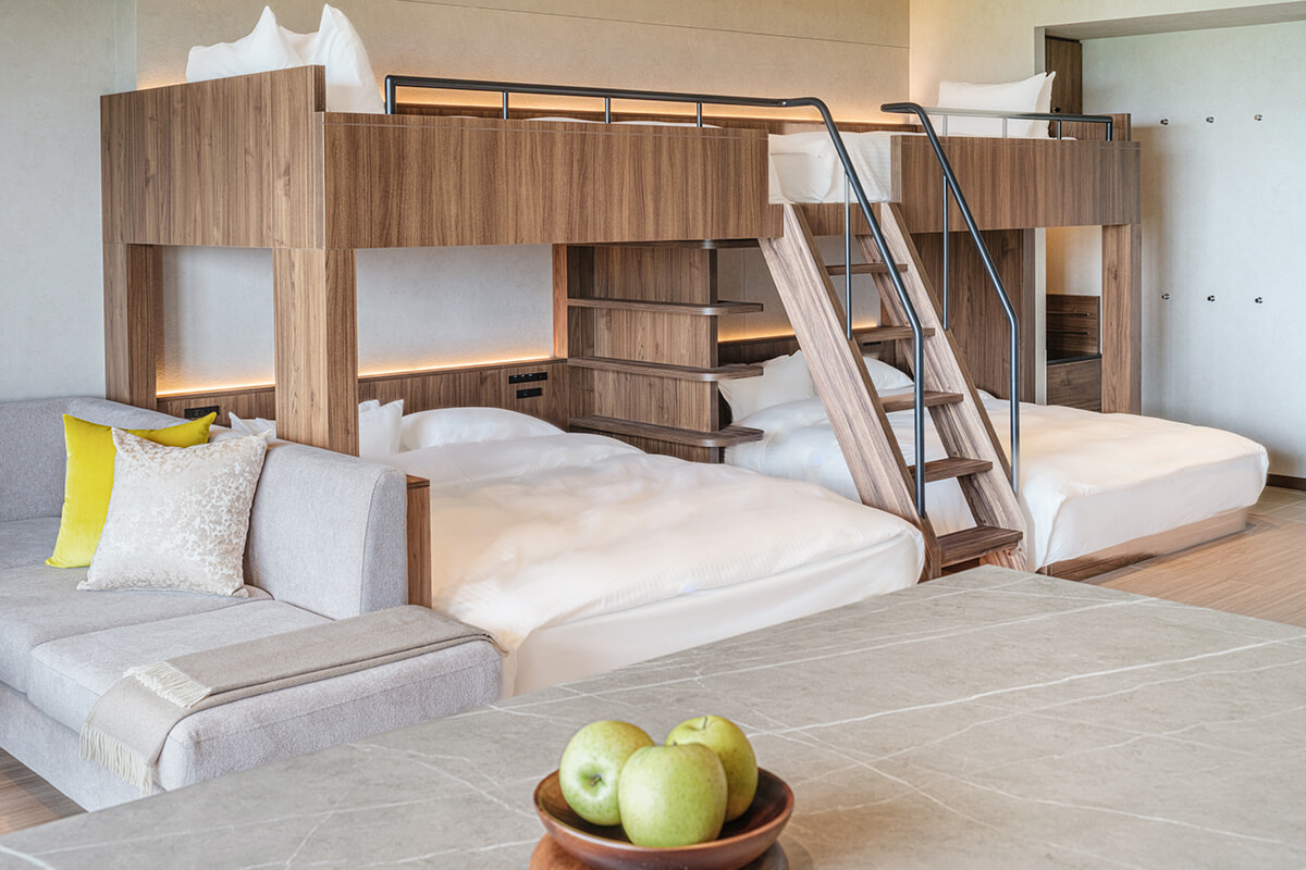 シンプル&ミニマムなデザインのスタンダードルームをはじめ、ラグジュアリーな空間にグループステイを可能にするバンクベッド(2段ベッド)やジャグジーを融合したタイプ。ジャパニーズモダンな畳付き和洋室やバリアフリータイプ。2フロアをメゾネットで繋いだ400m²超えのペントハウスなど、旅の目的やスタイル、人数に応じて多様な選択肢があるのはうれしいポイント。