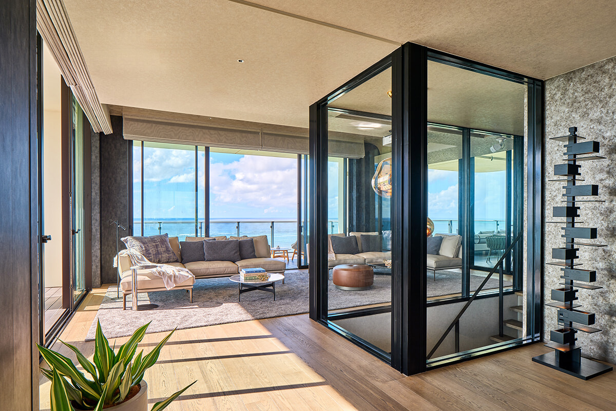 ホテル最上階の2フロアをモダン&ラグジュアリーに設えたザ・セブンペントハウス。客室内には、シェフズテーブルも叶うキッチン&メインダイニング、ワインセラー、プロジェクターを完備。広々としたバルコニーにはBBQができるアウトドアリビングのほか、サウナ、水風呂、ジャグジー付きのプライベートスパエリアも設置されている。ベッドルームは2つ。グリーンビューとオーシャンビュー両方を叶える計450m²の贅沢なメゾネットは、最大8名まで宿泊可能だ。
