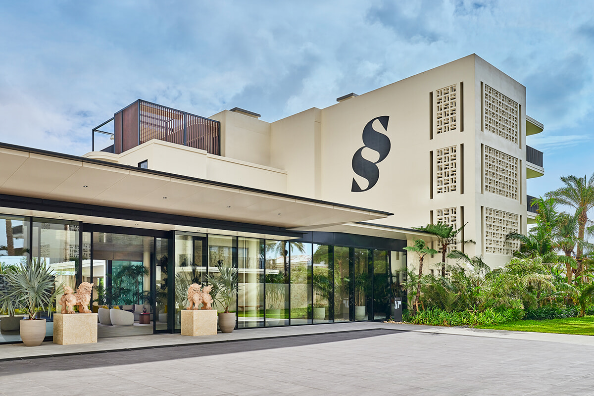 南ぬ島石垣空港から車で約18分。市中心部と隣接するリゾートエリア、真栄里(マエサト)ビーチを目前に望むセブン バイ セブン 石垣に到着する。周囲の景色が一変する琉球石灰岩のアプローチの先に現れるのが、「SS」のグラフィックがアイコニックなエントランスだ。
