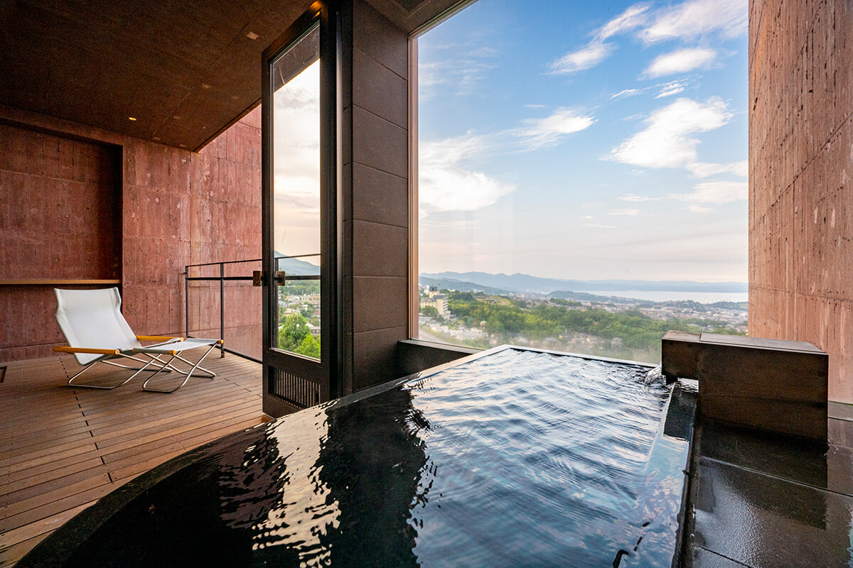 アート探索の拠点にぴったりなのがガレリア御堂原。高台から望む湯けむり街×海の景色もさることながら、館内にある70以上のアート作品は必見。別府の写真をコラージュした西野壮平の作品や、大巻伸嗣の球形オブジェなど、すべてオーダーメイド。館内アートツアーに参加した後は半露天風呂へ。絶景とアートに囲まれ温泉に浸かる至福のひとときを。