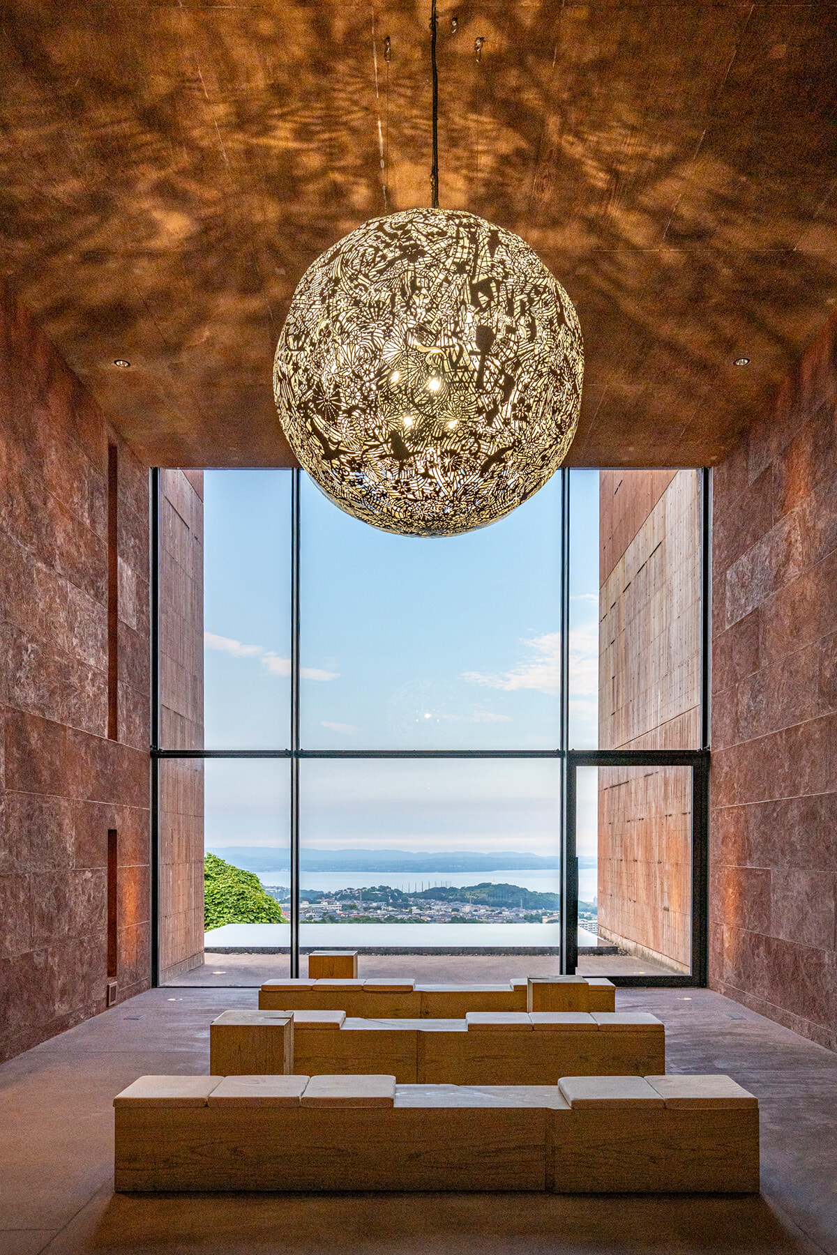 絶景が広がるエントランスには大巻伸嗣の『ゆだま』。時間によってLEDライトが点滅。