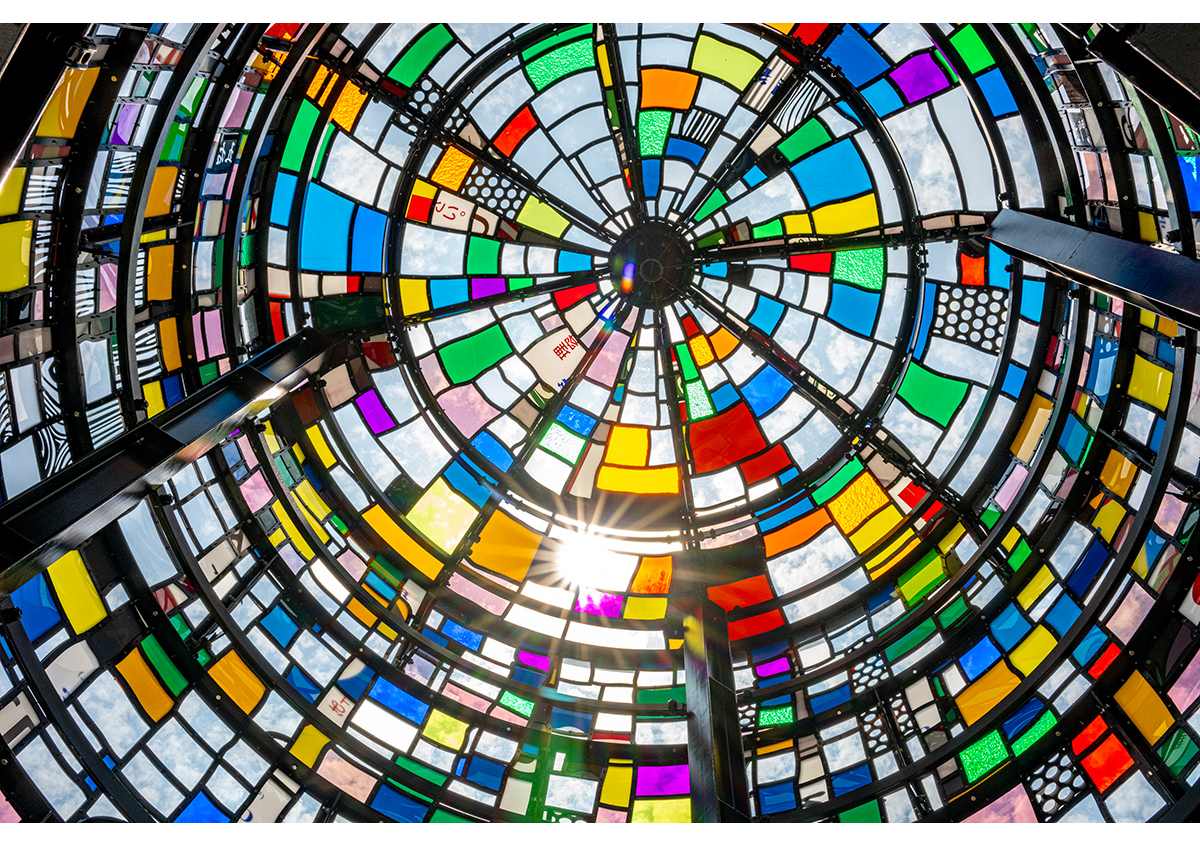 『オルタナティブ・ステート』で招聘されたのはブルックリンのアーティスト、トム・フルーイン。『ウォータータワー10:別府市、2023』は、市内の使われなくなったアクリル板を活用。下からのぞくと万華鏡のよう。