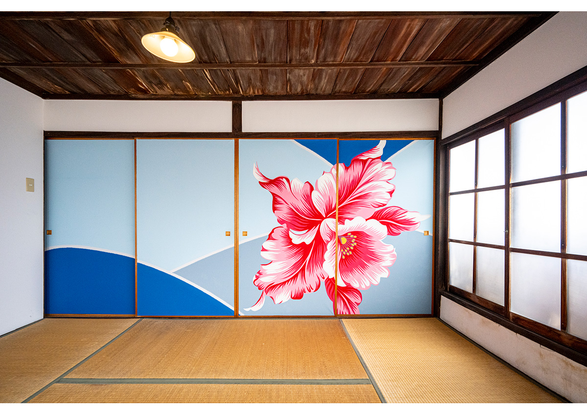 長屋を改装したミュージアムショップ、セレクトベップの2階(入館料¥100)には、マイケル・リンの襖絵。