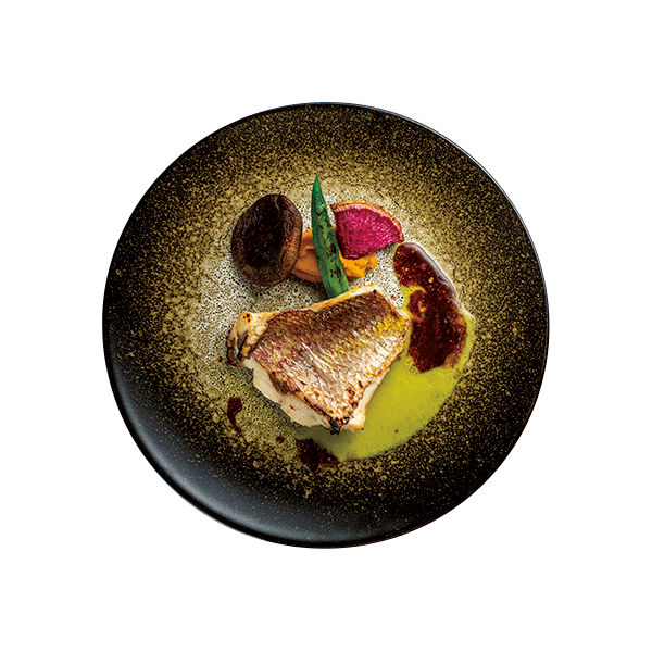 館内のレストラン、ザ・ピークは九州唯一の白レンガ窯料理が自慢。高温ゆえ加熱しても蒸気が出ず、食材に水分を閉じ込めふっくらとした仕上がりになる。写真は県産真ダイを使った「本日の鮮魚」¥3,850