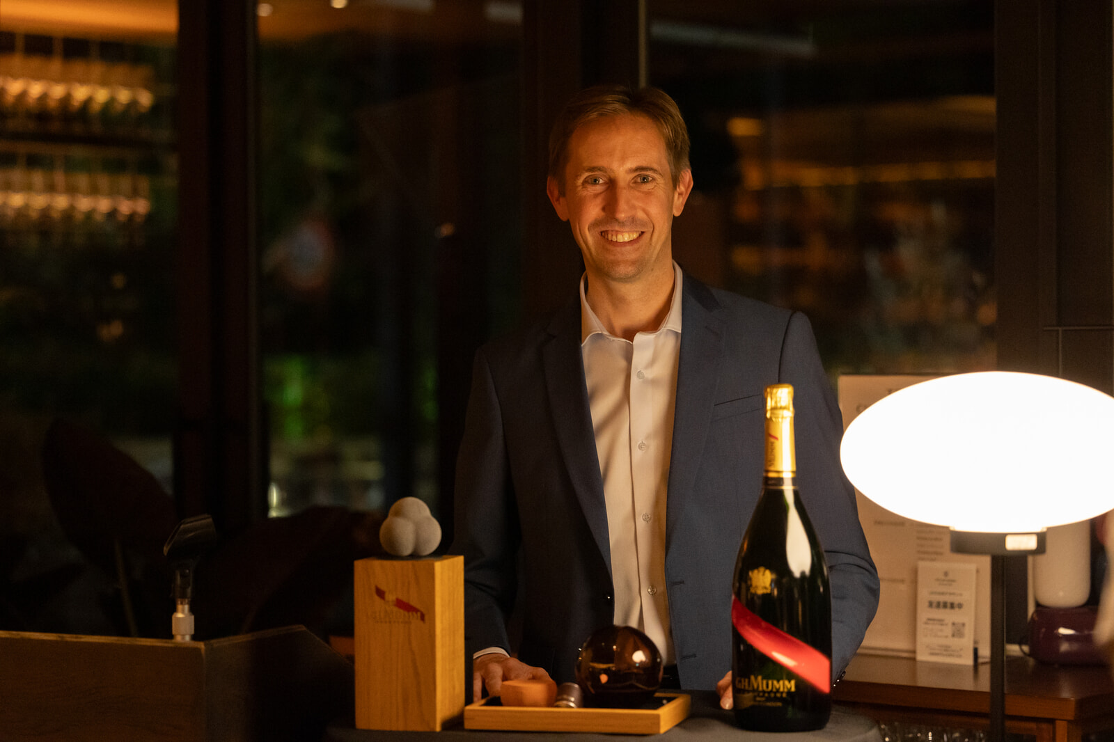最高醸造責任者ヤン・ムニエ。シャンパーニュ地方ヴィトリー・ル・フランソワで、ブドウ栽培とシャンパーニュの製造を行うメゾンに生まれる。農学、農業工学、醸造学の専門教育を受け、大手協同組合で研鑽を積み、その後大手メゾンで活躍。2024年より現職。今回が初来日で、「本場の日本料理とメゾン マムのマリアージュが楽しみ」と語る。