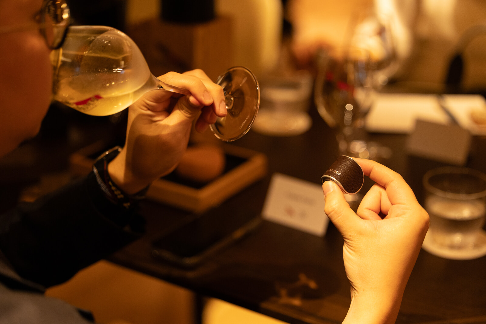 最初に、オブジェを持たずにマム グラン コルドンをひと口。果実味に満ちて甘やか、優しく心地よい酸味がストレートに伝わってくる。次にオブジェのメタル部分を指で押さえながら飲むと、ちょっとクールで軽やかな苦みを感じる。なんと不思議な……と思っていると、ヤン・ムニエが「それはミネラル感です。よりフレッシュさを感じたのでは?」とにっこり。次にレザー部分に触れながら味わうと、ほんのりとしたまろやかさを感じ、味の二面性に驚かされる。ヤン・ムニエはこう説明してくれた。