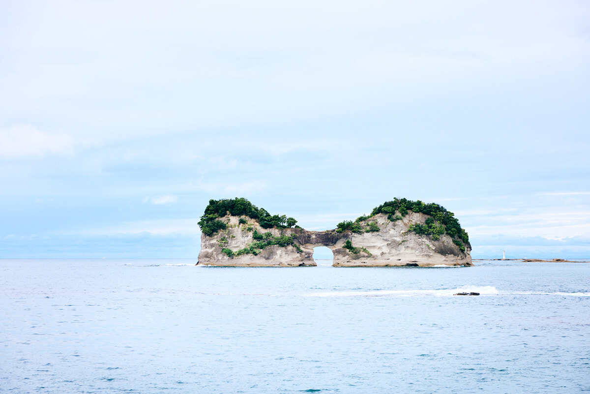 白良浜からさらに海沿いの道を北へ走ると、白浜のシンボルにもなっている「円月島」が見えてきます。約6,600万年前~163万年前の礫岩(れきがん)でできた島で、真ん中には波の浸食で削られてできた穴がぽっかり空いています。