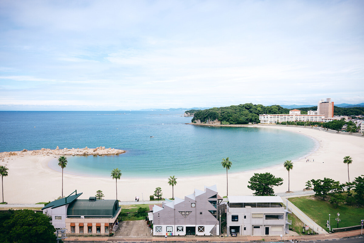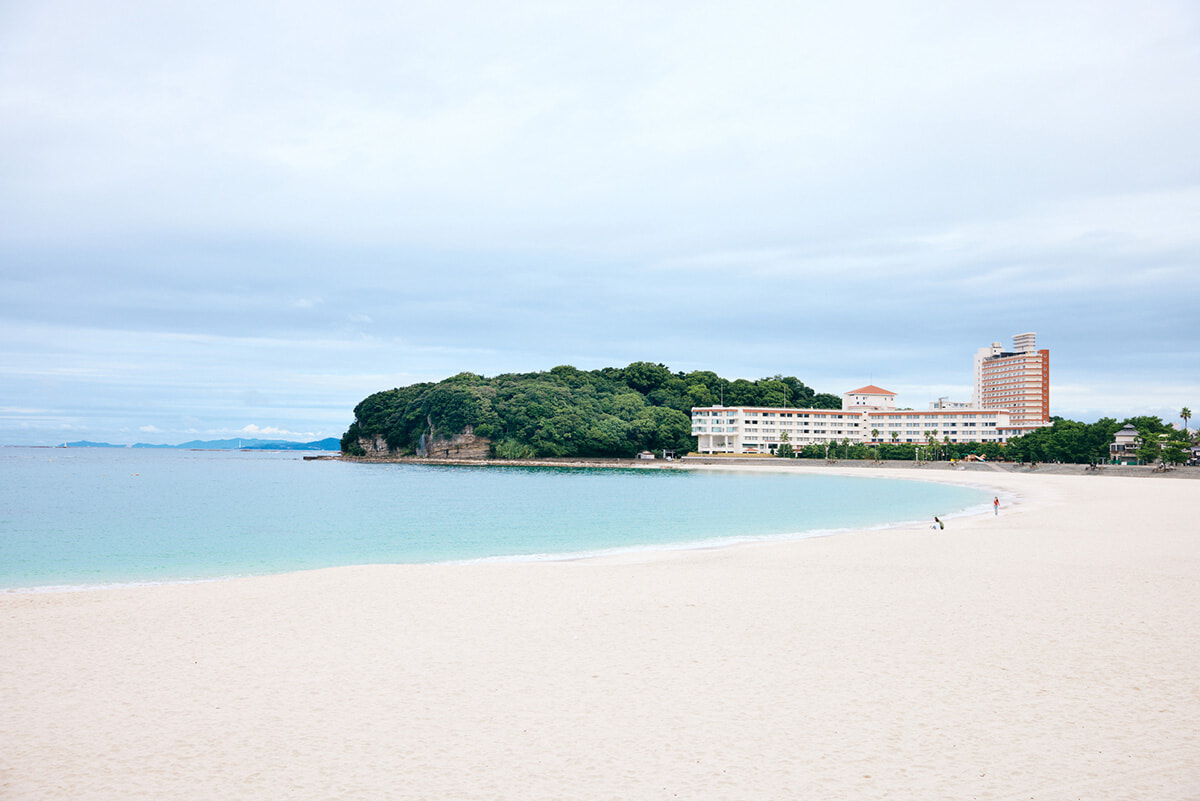 崎の湯を出て海沿いの道を北に走るとすぐ、弓なりになった白砂のビーチが現れます。白浜の名の由来にもなった「白良浜(しららはま)」です。