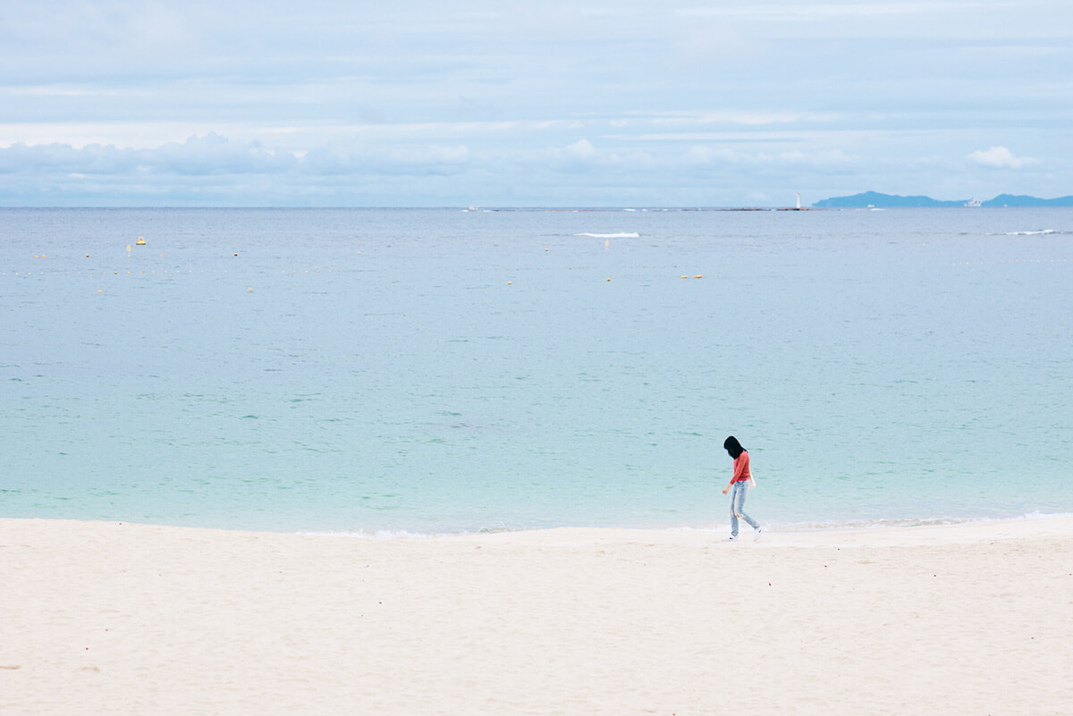 ビーチに降り立つと、青と緑のグラデーションを織りなす海とサラサラの白い砂のコントラストが美しいこと! 秋の静かな浜辺は人も少なくて、ロマンチックな時間が流れます。
