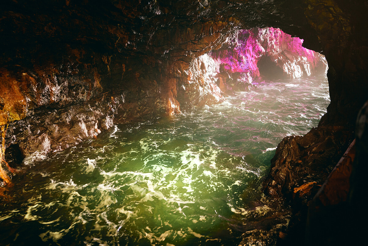 三段壁の崖下には波の浸食でできた「三段壁洞窟」があり、平安時代の源平合戦で源氏に加勢した熊野水軍が船を隠したという伝説の場所を間近で見ることができます。洞窟の岩壁に激しく砕ける波を見ると、熊野水軍のもつ操船技術のすごさが想像できますよ。