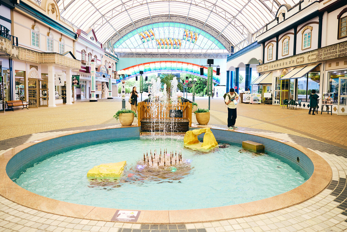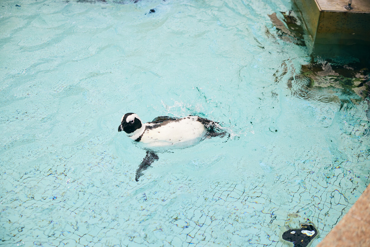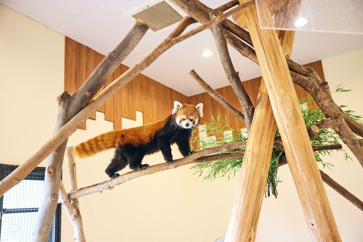 エントランスドームに入るや否や、噴水の水面に目線を下げると、ペンギンがスイスイ泳いでいるではないですか! ここって、お土産屋さんがある場所だよね……と驚きを隠せません。さらに建物の一角には、なんとレッサーパンダのいるスペースも。その距離近し!