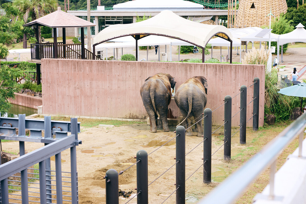 ドームを抜けると、まず目に入るのは、壁に向かってたたずむアジアゾウの「おしり」。壁の反対側にまわると……穴から鼻を出して、ゲストからおやつをもらっていました!