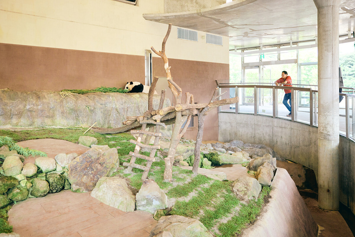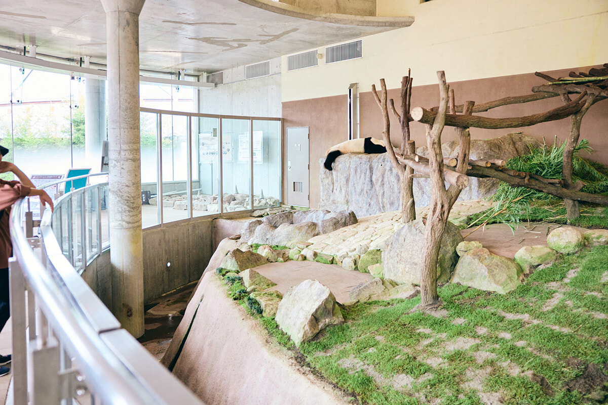 お母さんの良浜(らうひん)ともう1頭の娘・彩浜(さいひん)はブリーディングセンターにいるというのでそちらへ移動。パンダは午前中のほうが活発で、午後は寝ていることが多いそうですが、良浜が起きていました!