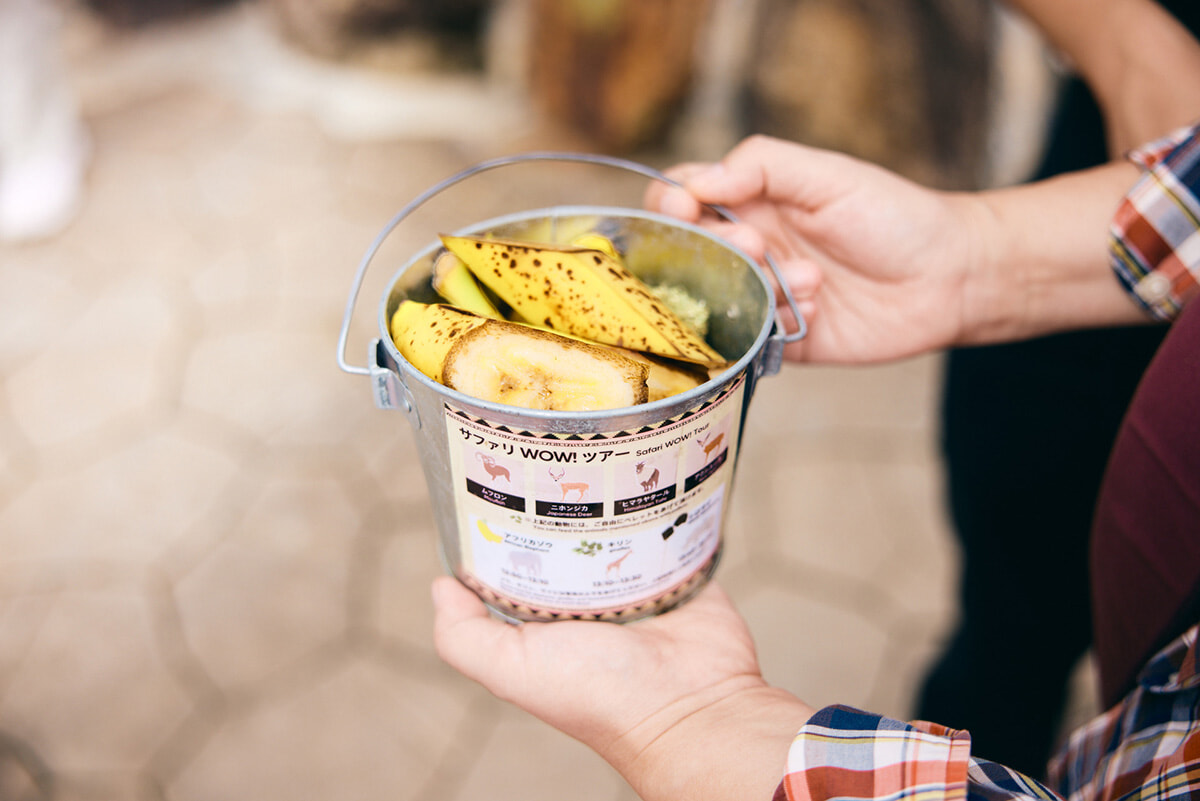 アフリカゾウ、アミメキリン、シロサイ、ムフロン、ニホンジカ、ヒマラヤタール、アクシスジカへの餌が入ったバケツを受け取るところからツアーはスタート。