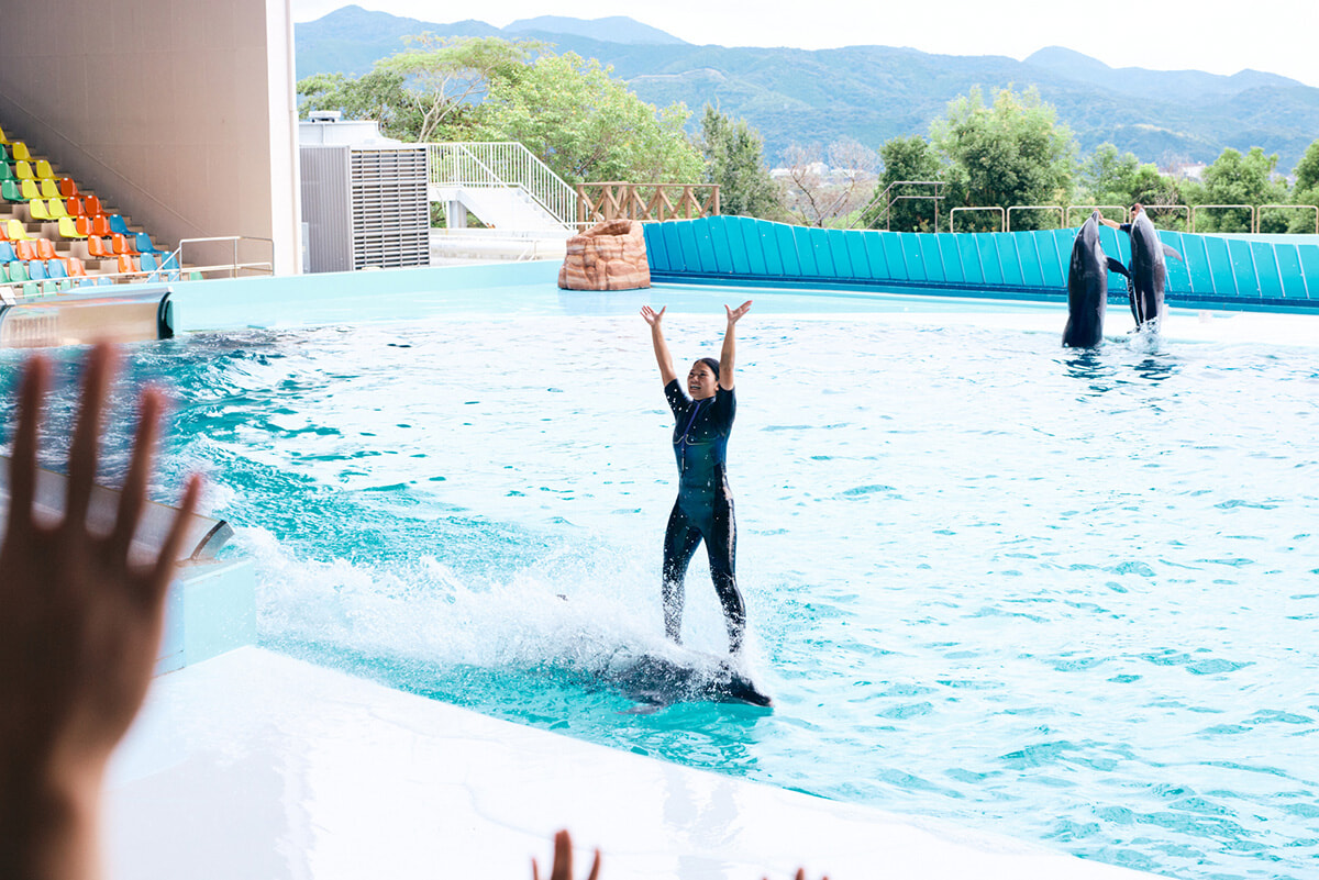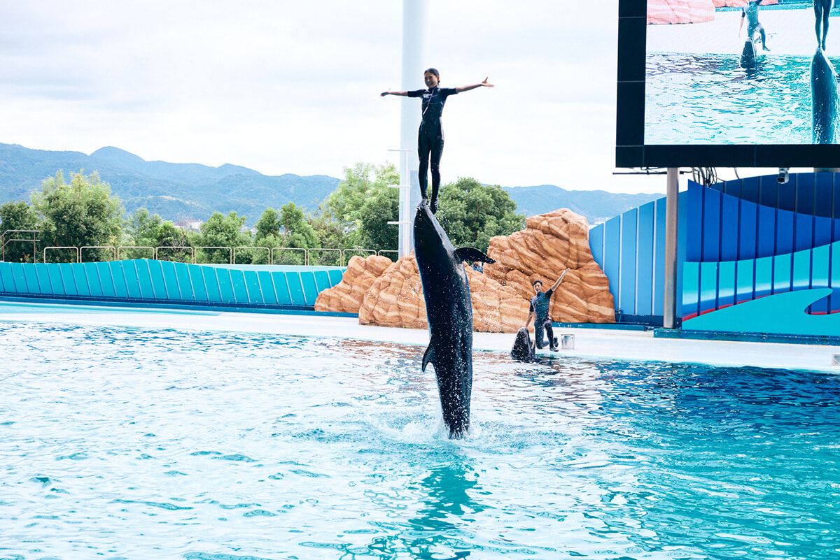 日本一との呼び声も高い「マリンワールド」でのイルカショーは必見です。その名もマリンライブ「Smiles」。イルカとトレーナーとの絆がテーマで、息がぴったりのパフォーマンスは圧巻!