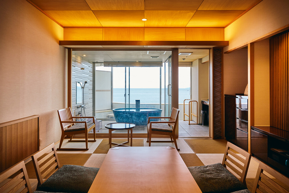 ちなみに、三楽荘では、源泉かけ流しの露天風呂付き客室のほかに、マイクロバブルの湯船が女性に大人気のミラバス付き客室、海ビューのお風呂はないけれどよりリーズナブルに泊まれる客室など、さまざまな部屋タイプがあるので、予算と気分にあわせた選択が可能です。