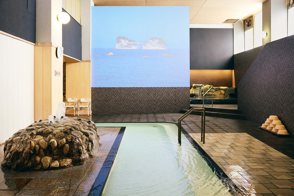 ザッパーン! ダイナミックに波が打ちつけるのは、大人気の公衆浴場「崎の湯」です。