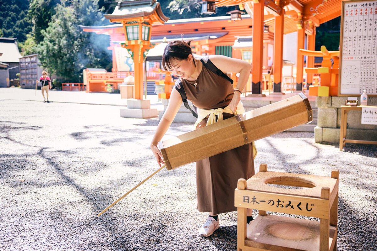 熊野那智大社名物ジャンボおみくじ。筒の長さは133cmで日本一です。引く人みんな笑顔で楽しそう。