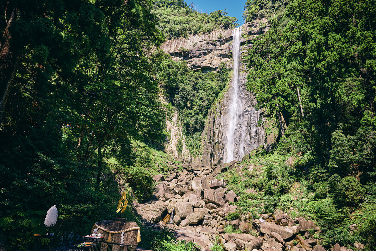 到着すると、鳥居の奥に轟音とともに流れ落ちる滝の姿が! 133mという日本でも指折りの落差を誇る滝は大迫力です。滝そのものが御神体とされ、社殿はありません。