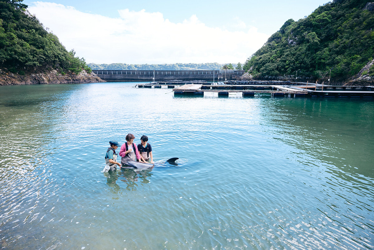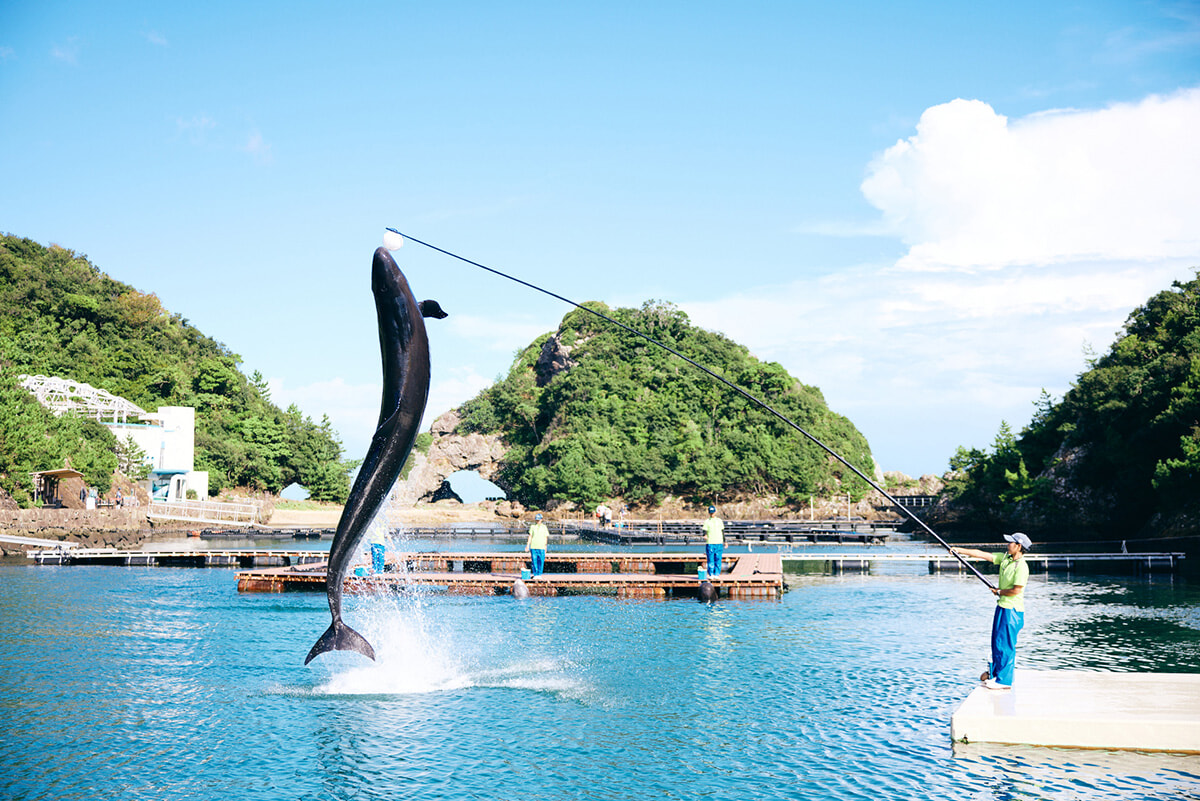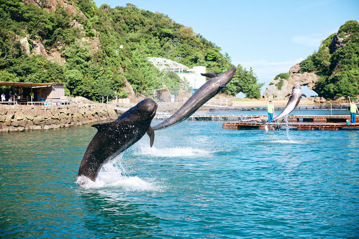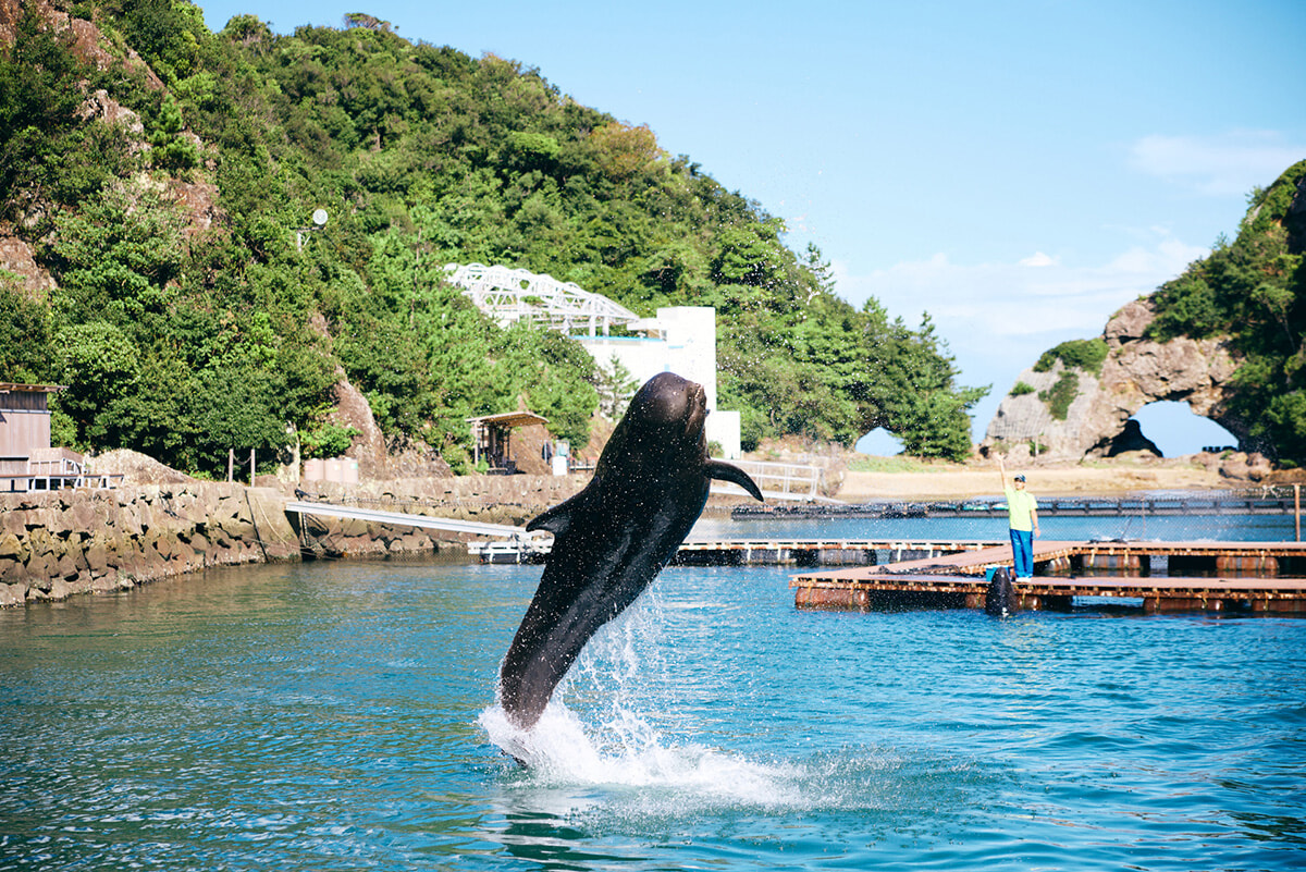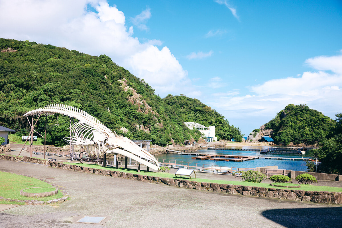 博物館のエントランスに入ると、海と山が織りなす景観が美しい天然の入り江が広がります。ここにクジラやイルカがのびのびと自然体で暮らしています。自然環境があまりにすばらしいので博物館の方に聞いてみると、なんと、この辺り一帯は吉野熊野国立公園の一部とのこと。