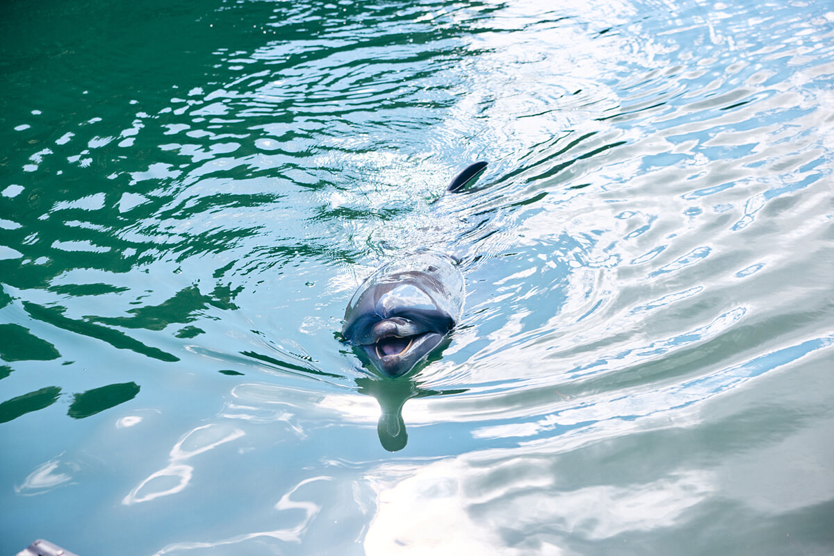 OKの合図が出たら、ふれあいタイムのスタートです。まずはやさしく背中をナデナデします。ルナちゃんの肌は、長靴のようなキュキュっとした触り心地ですが、ほんのり温かくて哺乳類なんだなぁと実感。イルカの体温は36〜37度と、人間とほぼ同じなのだそう。