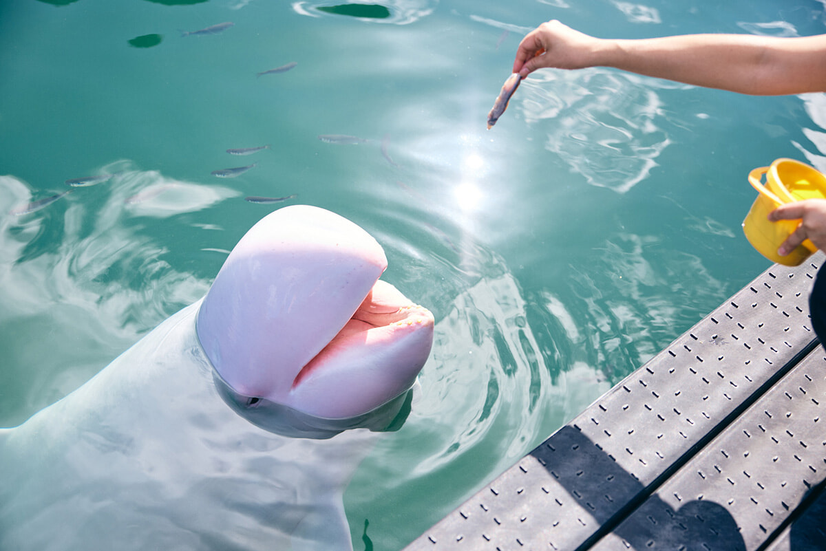 今度は餌あげ体験。きれいな白クジラは、ハマタちゃん。