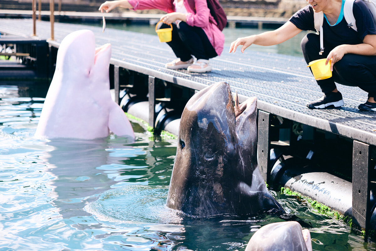 続いて、桟橋で餌あげ体験へ。魚をかざすと海中からクジラたちがニョキっと現れます。 出てきたのは、丸っこい頭がかわいいハナゴンドウでした。