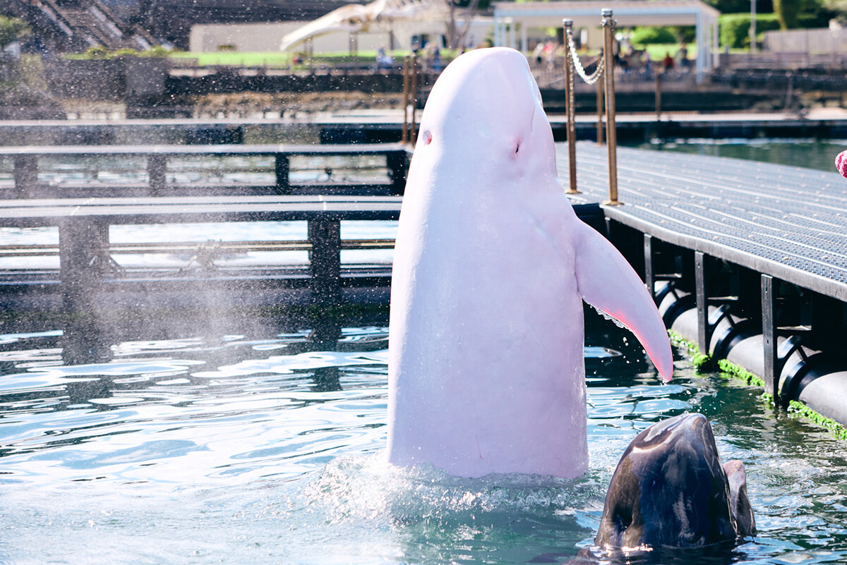 それにしても、やっぱりクジラは大きい! 内容は、一般的なイルカショーと同じですが、身体が大きいので、ジャンプひとつとってもダイナミックでものすごい迫力! 大きいのに目の前でくるくるスピンもしちゃうので、観客一同拍手喝采です。