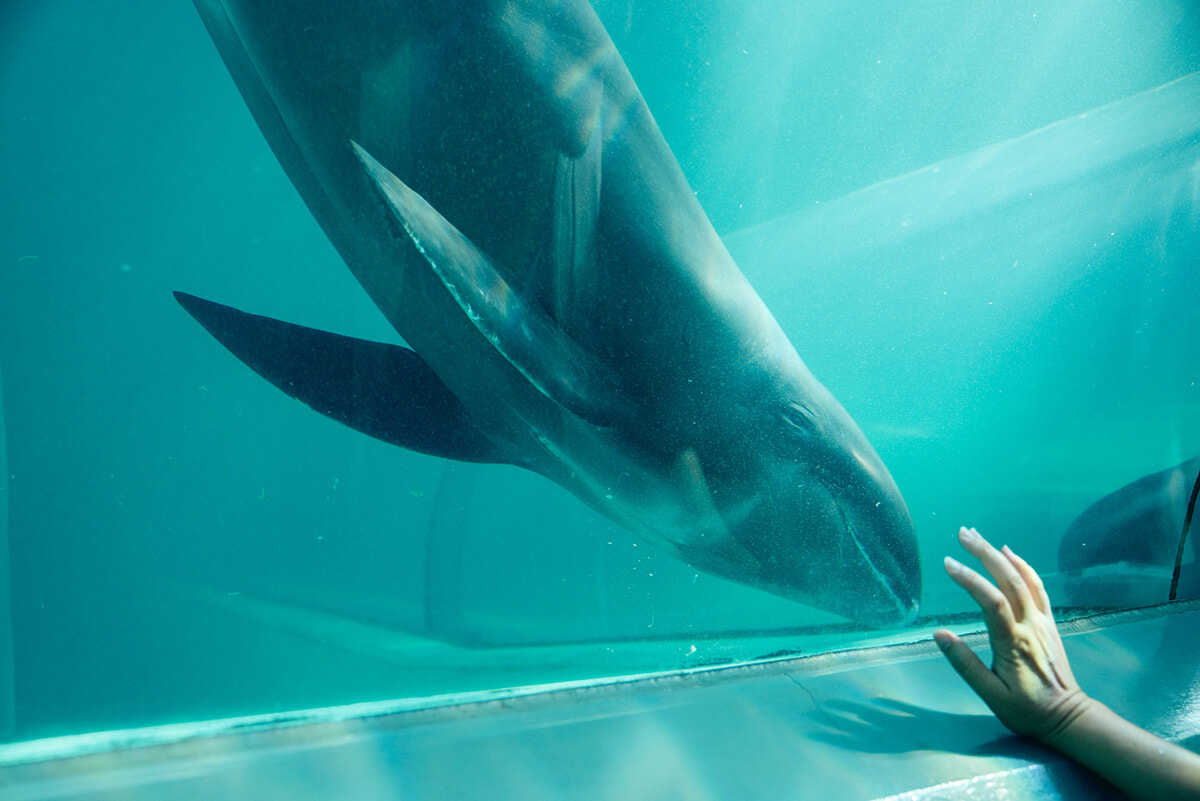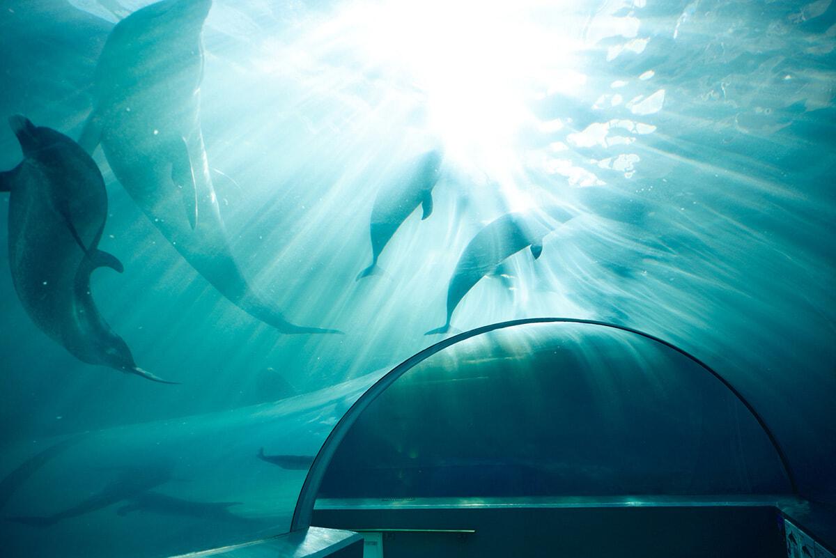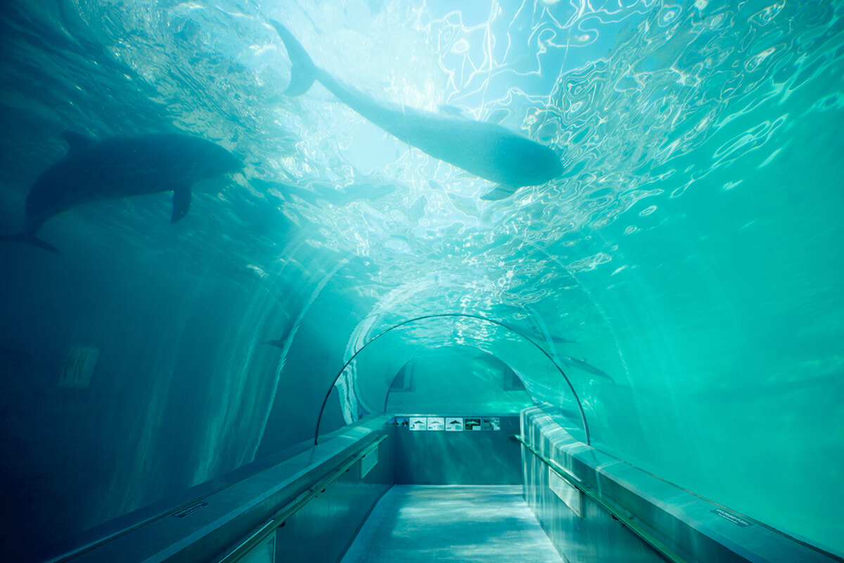 入り江の奥の海洋水族館「マリナリュウム」では、クジラやイルカたちが水中トンネルの上を泳ぎまわっています。