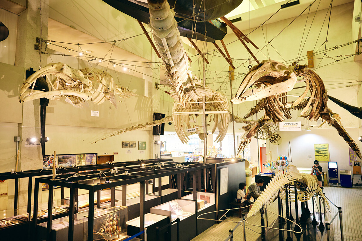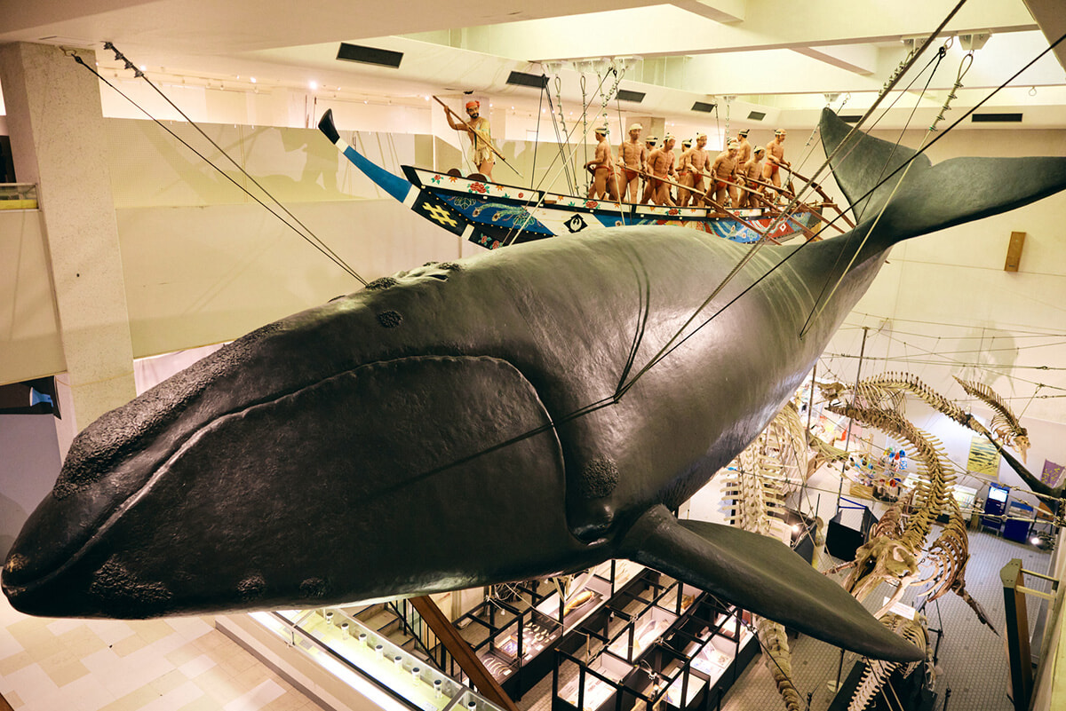 博物館の館内へ。絶滅危惧種のセミクジラの骨格標本などが天井から吊り下げ展示されています。