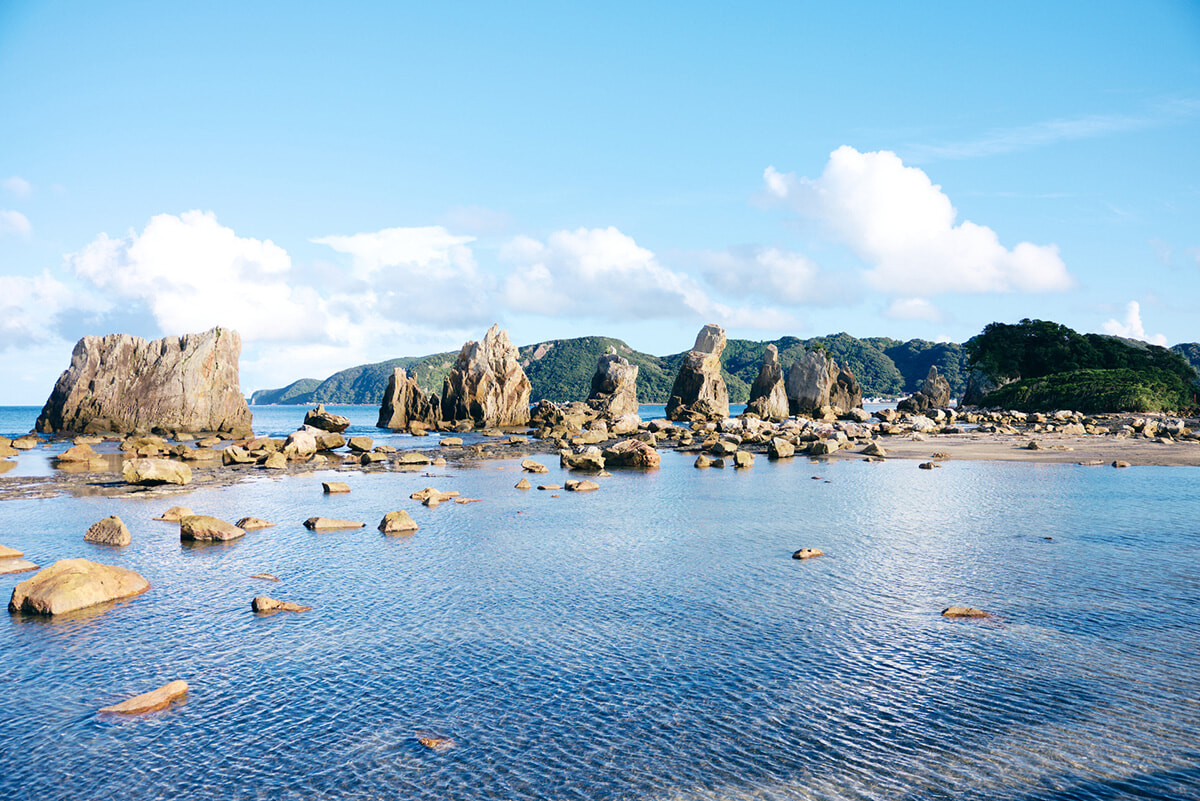 途中には、吉野熊野国立公園の景勝地がちらほら。中でも、本州最南端の町・串本町の「橋杭岩」は必見なので、休憩もかねて立ち寄りましょう。ちょうど道の駅「くしもと橋杭岩」の駐車場からこの絶景が眺められるのです。