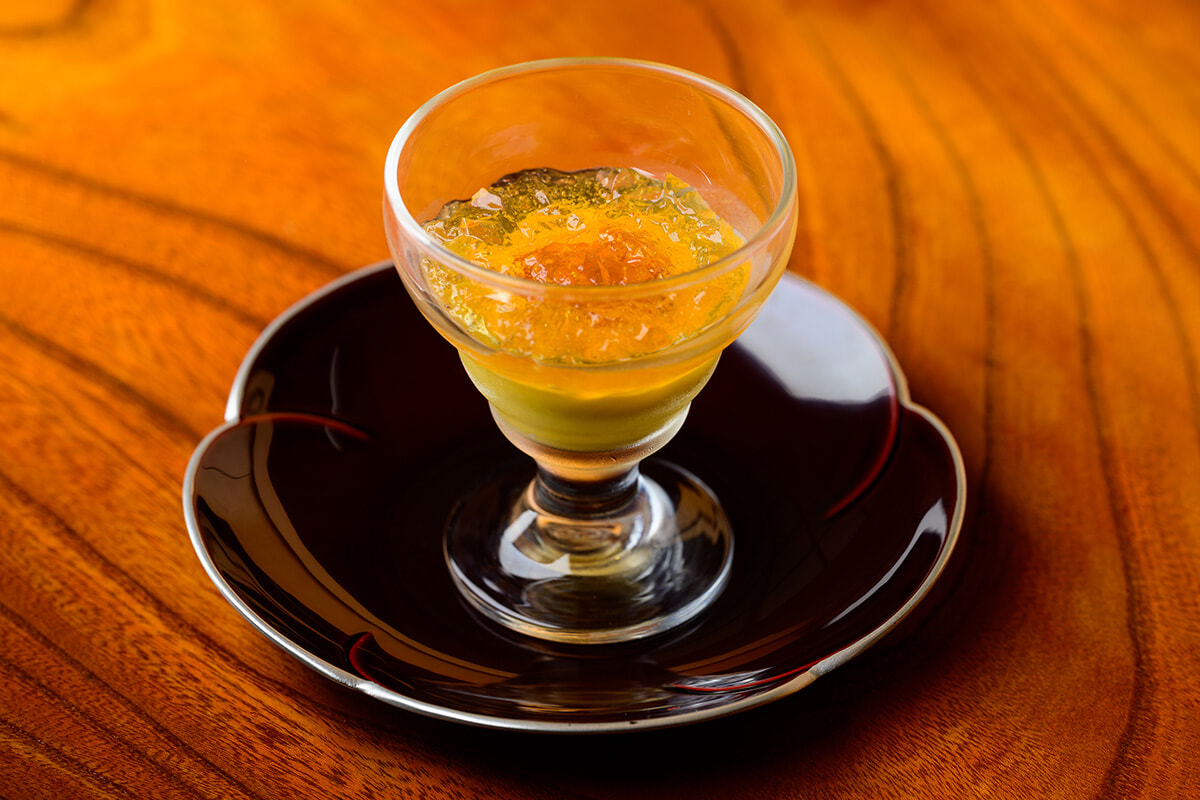 ル・ブルギニオン仕込みのスターターは「人参のムース、コンソメジュレとウニのせ」。なめらかなムースとウニが口のなかでとろけ、次なる一品への期待が高まる。¥12,000のコースから。