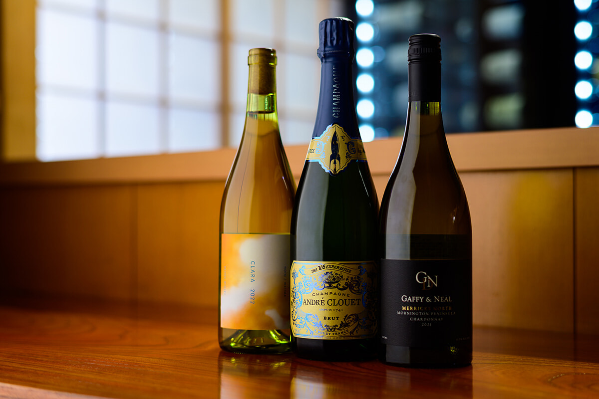 ワインもクラシック系とニューワールドでラインナップ。フランスの注目メゾン、アンドレ&クルエのシャンパーニュ(中央)のほか、シェフお気に入りの一本、能登・門前前のハイディ ワイナリーの「Clara」(左)。グラス¥1,400~