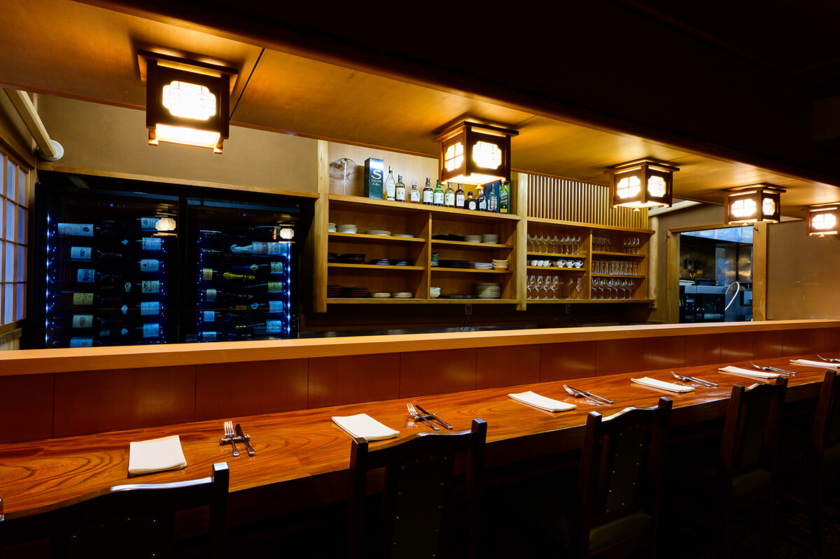 以前割烹だった空間を生かした金沢らしい落ち着いたカウンター。王道フレンチの良さを知る大人の常連も多い。
