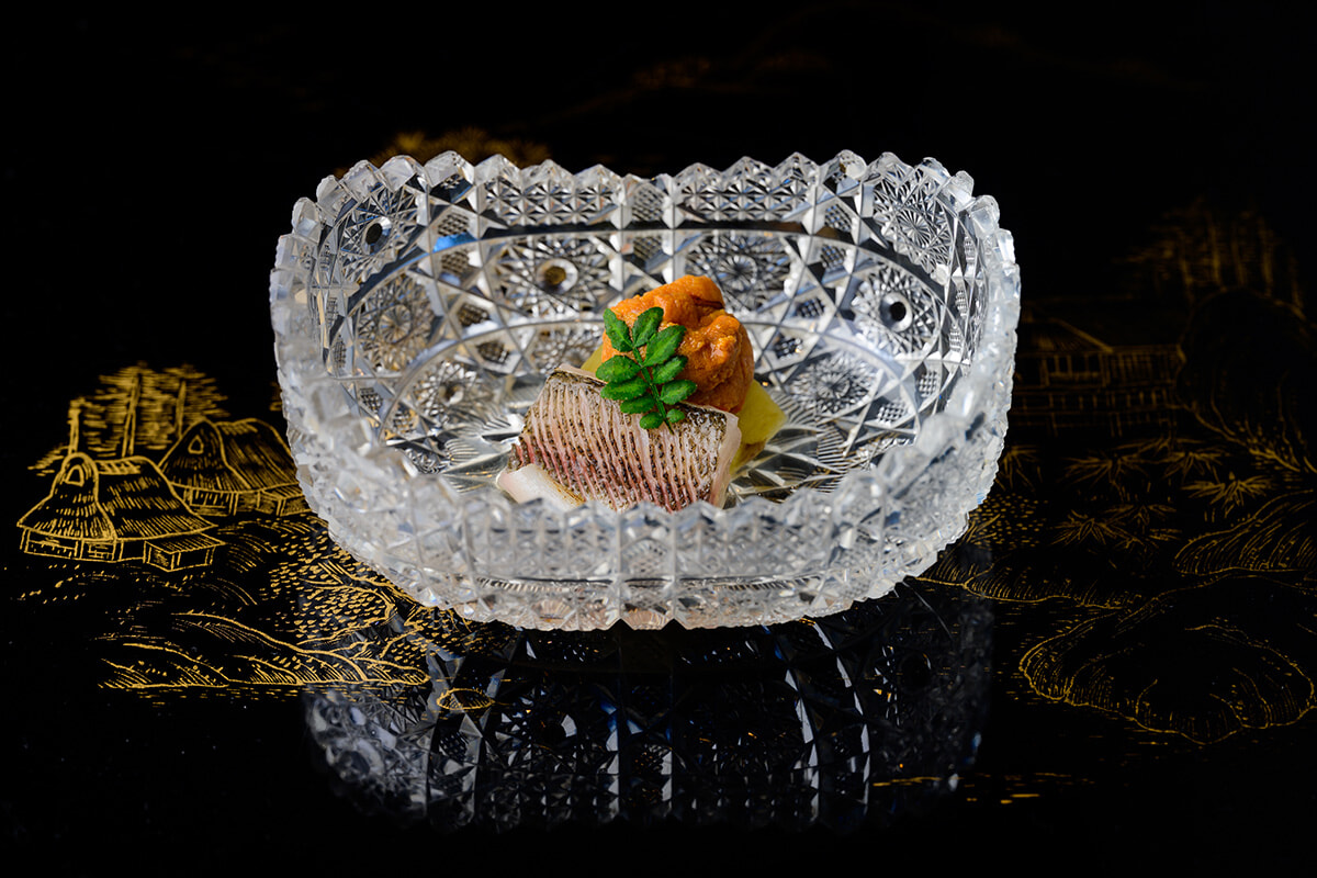 「かますと冷やし茄子のウニのせ」は、輪島塗の盆とクリスタルのコンビネーションで。店主は石川・能登町出身で実家に眠る輪島塗ほか、古九谷や作家ものなどうつわへのこだわりも魅力。